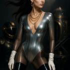 A stunning figure in a sleek, metallic bodysuit stands against a cosmic backdrop. She wears elegant gloves and layered necklaces, exuding a futuristic, fashion-forward vibe among planetary orbs.