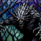 A menacing creature with sharp claws and fierce yellow eyes emerges from a dark, abstract background of intertwined branches and vibrant, colorful leaves, resembling a stained glass artwork.