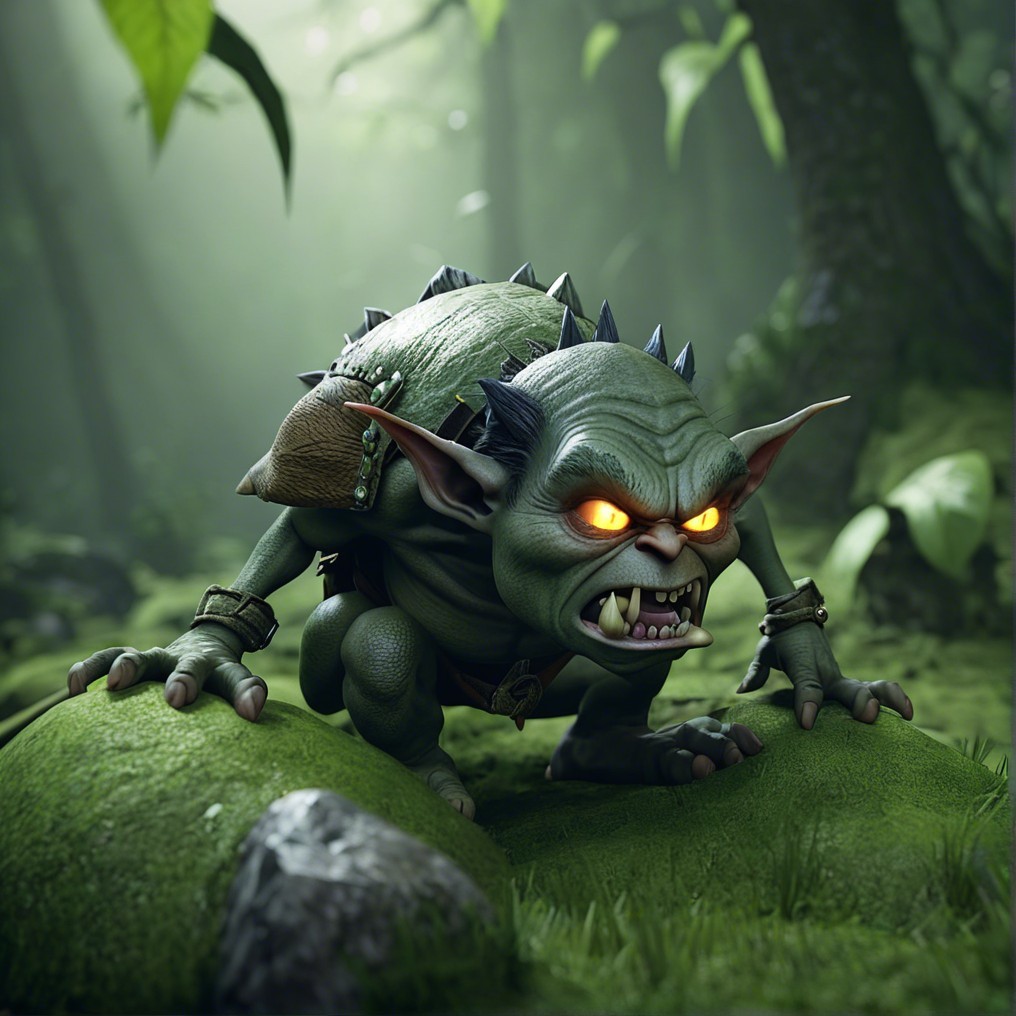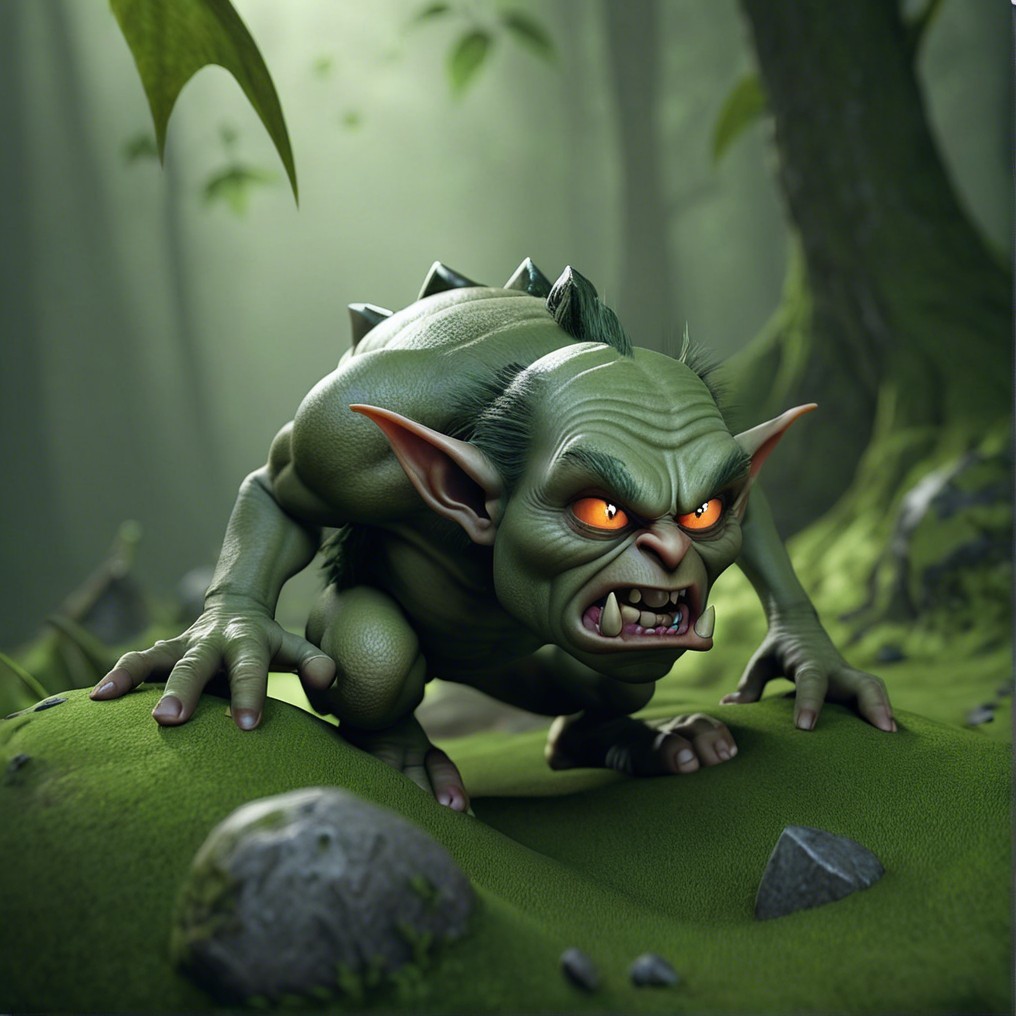 A grotesque green goblin with fiery orange eyes crouches on a mossy ground, surrounded by lush foliage and rocks. Its menacing expression adds to the eerie atmosphere of the enchanted forest.