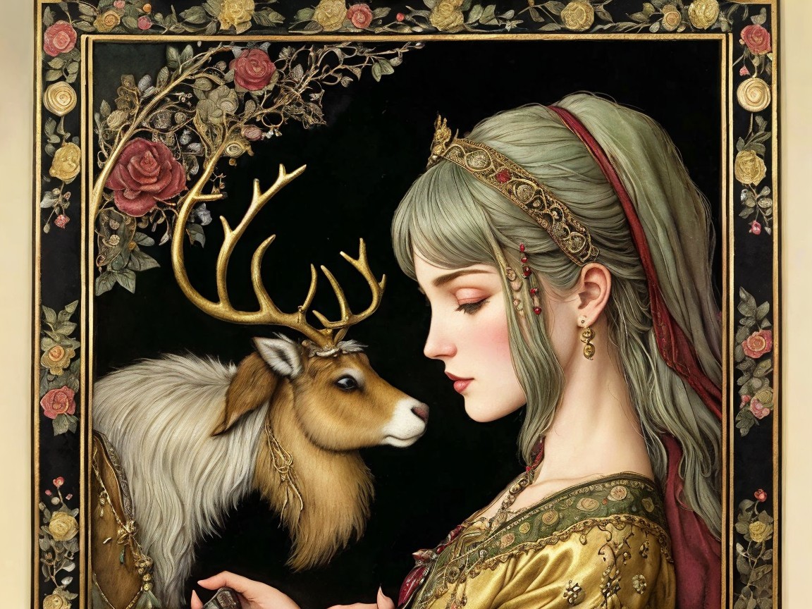 Prompt: "Legend of the girl and the magical reindeer,, 3rd century Persian miniature art. Velvet Black, Shabby, Dull Gold, olive green, burgundy, Golden Ratio, Surreal Fantasy, Elegant, High Definition Ultra Fine 3D Line, Zenangle Style, Watercolor Patchwork , Arthur Rackham Style, Paul Kidby, Gediminas Prankevicius, Jacek Jerka, Extremely Detailed, Intricate, Thoughtful, HDR, Fractal, Beautiful, Award Winning, Fantasy Look, Fantasy, Crisp Quality