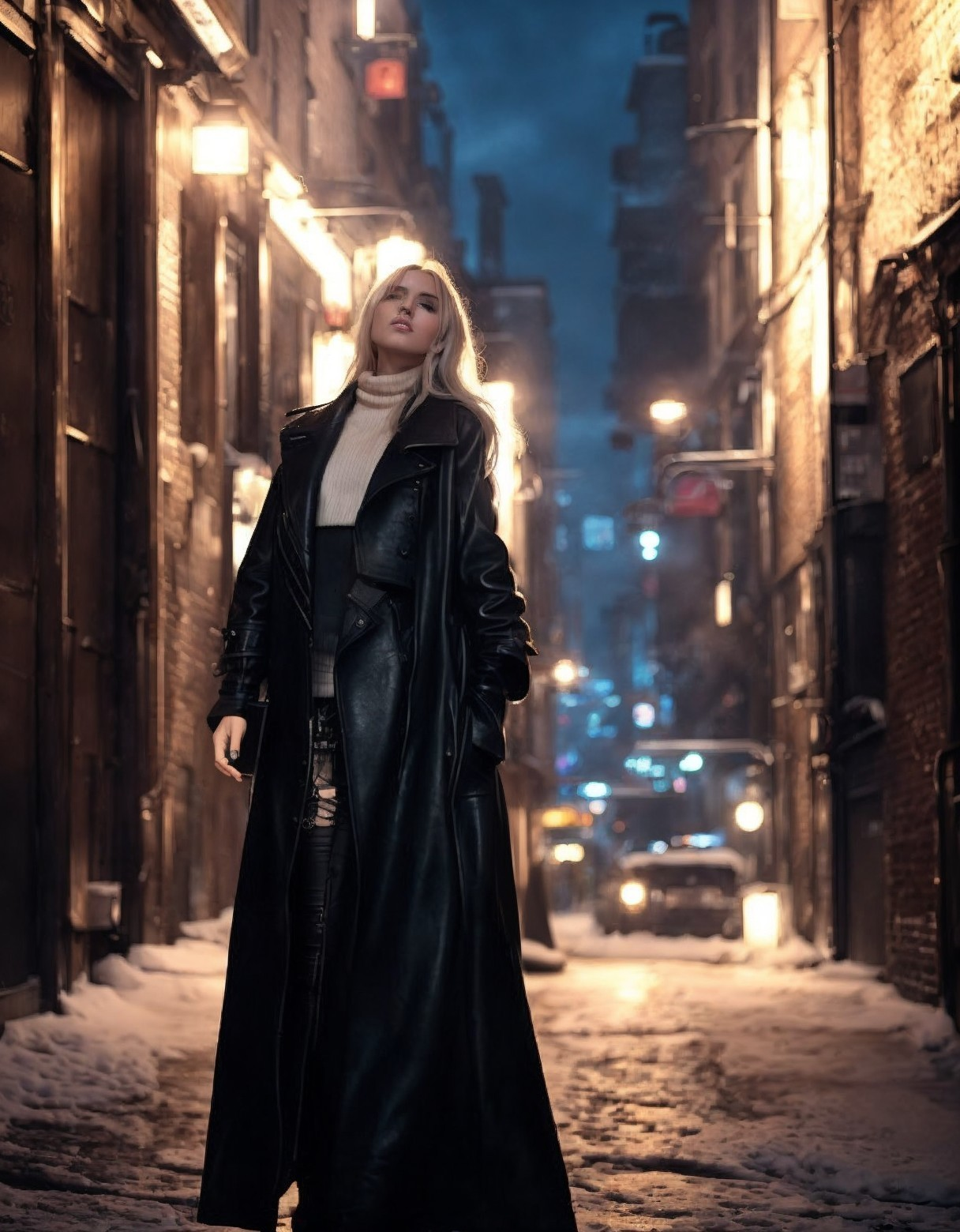 Prompt: 151515: A stylish young woman stands confidently in a narrow, snow-covered alleyway at night. She wears a long, black leather coat over a cozy sweater, paired with ripped jeans. The scene is illuminated by warm, ambient street lights, casting a glow on the cobblestone path. The atmosphere is moody and cinematic, with a hint of mist in the air, evoking a sense of mystery and urban elegance. Soft muted palette of whites,blues,grays,enhancing otherworldly quality,blurry edges,serene atmosphere,inviting tranquility;
