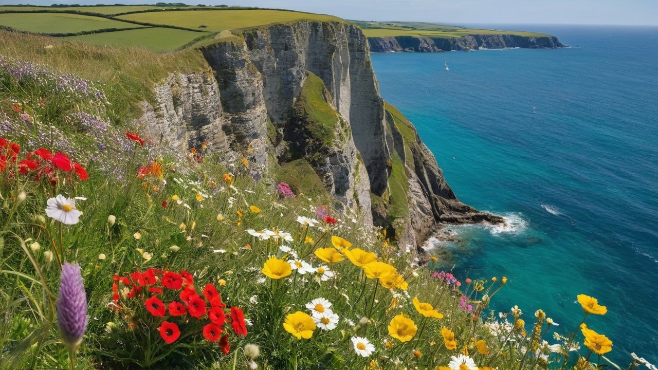 Coastal Scene with Cliffs and Vibrant Wildflowers