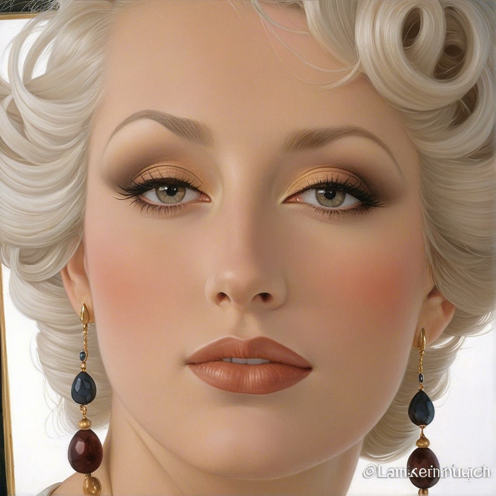 A glamorous portrait of a woman with elegant blonde curls, striking gold eye makeup, and bold red lips. She's adorned with colorful gemstone earrings, exuding a classic Hollywood vibe.