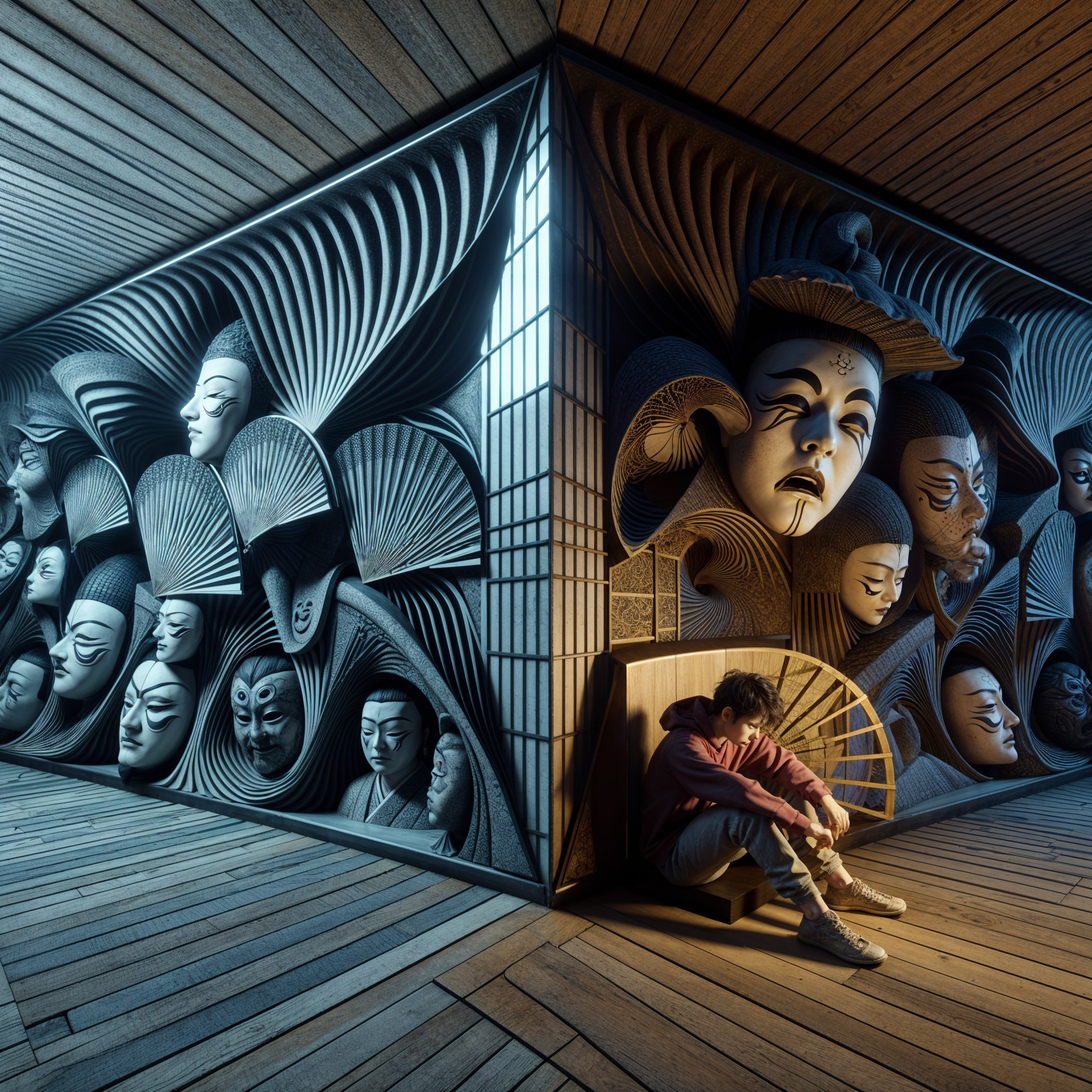 A striking scene showcases a deep corner where traditional Japanese masks and elaborate fans create a mesmerizing interplay of shadows and colors, highlighting cultural artistry and emotion.
