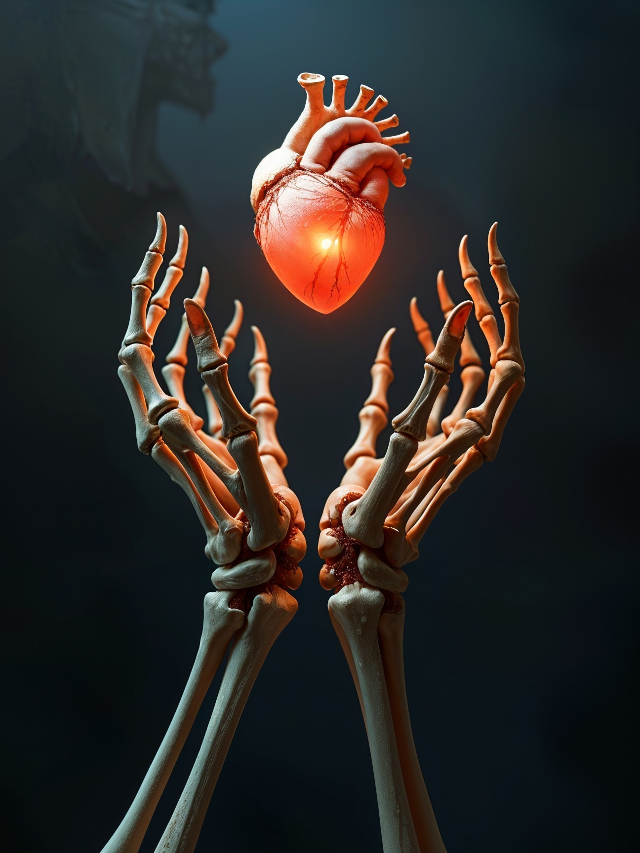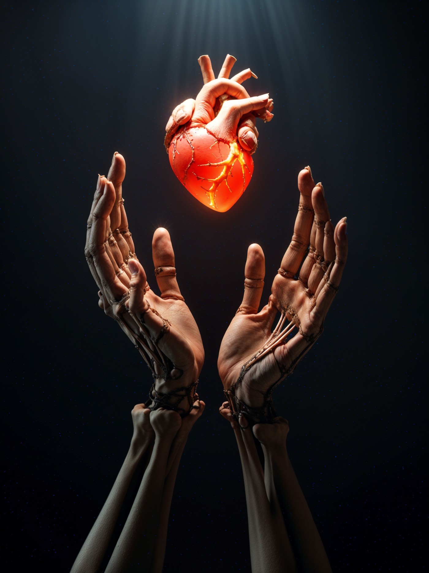 In a dark setting, two human hands are raised, supporting a glowing, realistic heart. The heart appears to float, illuminated by soft light, creating a striking contrast and emotional impact.