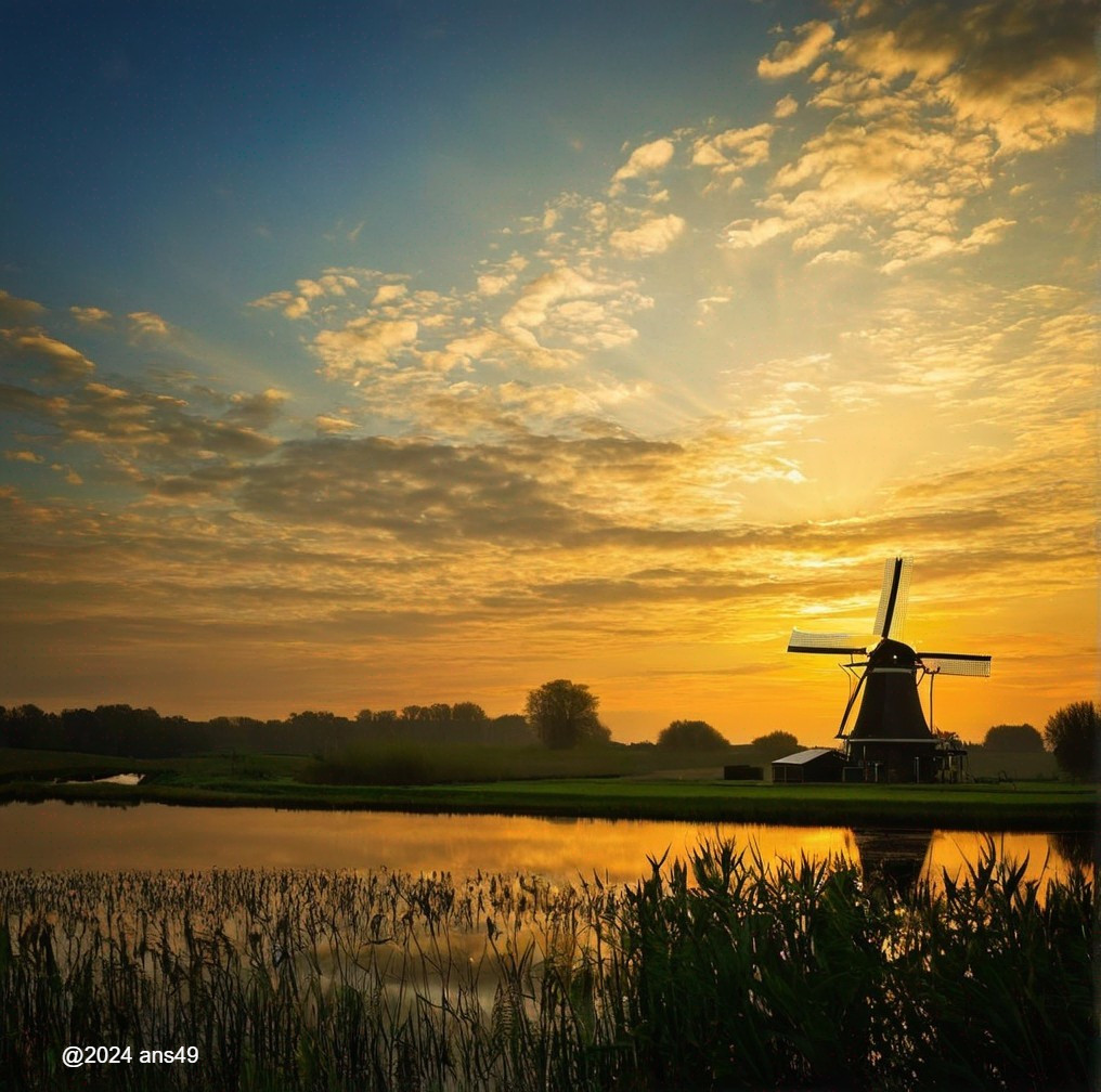 Sunset with a silhouetted windmill by a river, under a vibrant cloudy sky.