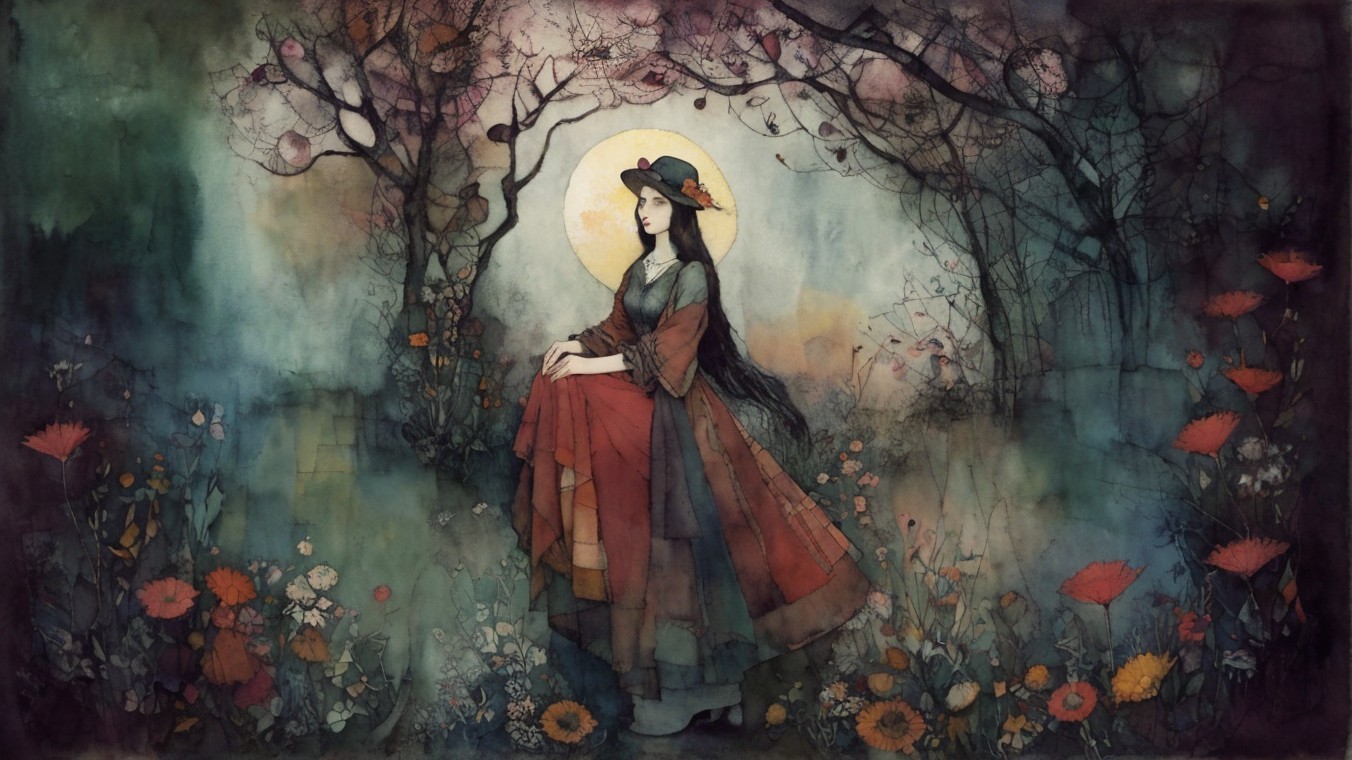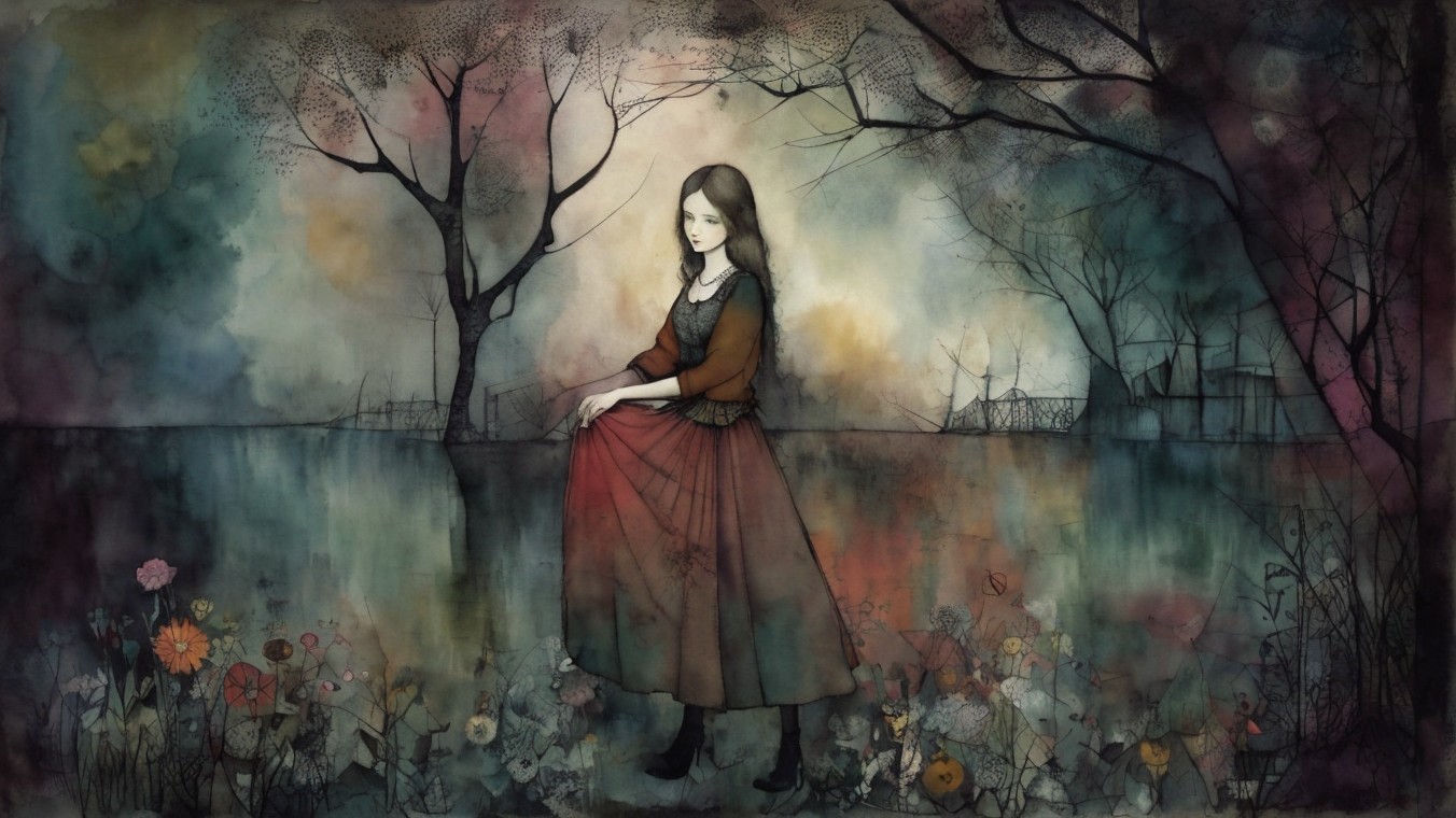 Patchwork fading tones of melancholy vintage summer nostalgia, soul search in portrait in ochre, patina of wine stains, mercury glass. Light and gossamer haze. art brut, moody, somber, desaturated colors, in the style of Paul Klee, Arthur Rackham, Banksy Stunning stylized, beautiful woman, intricate zentangle illustration, watercolor and ink painting, meticulous detail with fine pen strokes, intricate patterns, fractals, ochre and indigo colors, Amanda Clark, Catrin Welz-Stein, Zdzisław Beksiński, and Dee Nickerson