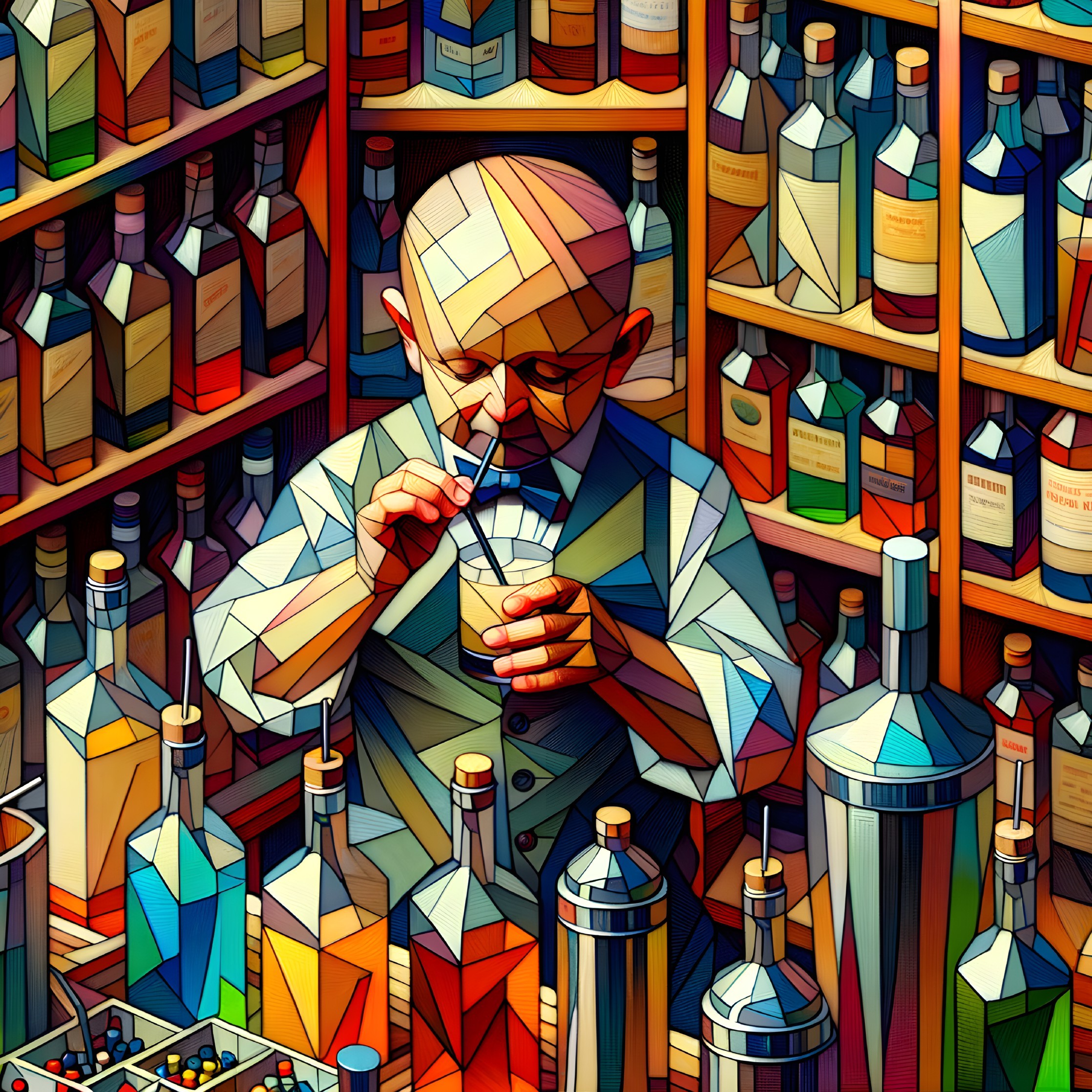 A geometric, colorful illustration depicts a bald man in a vest sipping from a glass amidst a shelf filled with various bottles. The scene blends abstract shapes and vibrant hues.