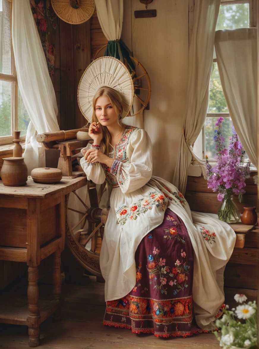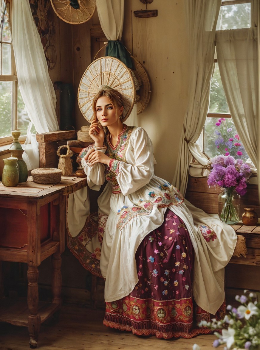 A woman in traditional attire sits by a wooden table near a window, surrounded by flowers, gazing thoughtfully.