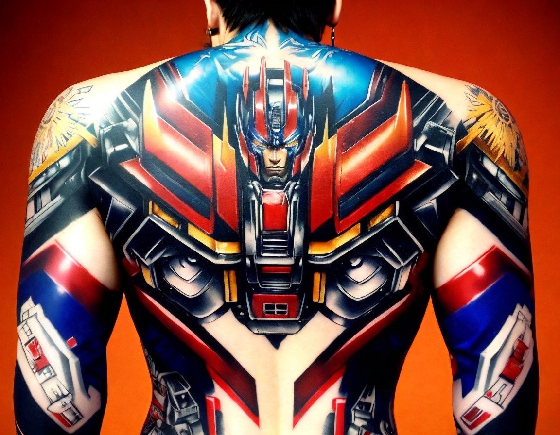 A person with a detailed, colorful back tattoo depicting Optimus Prime from Transformers, surrounded by floral designs on the arms.