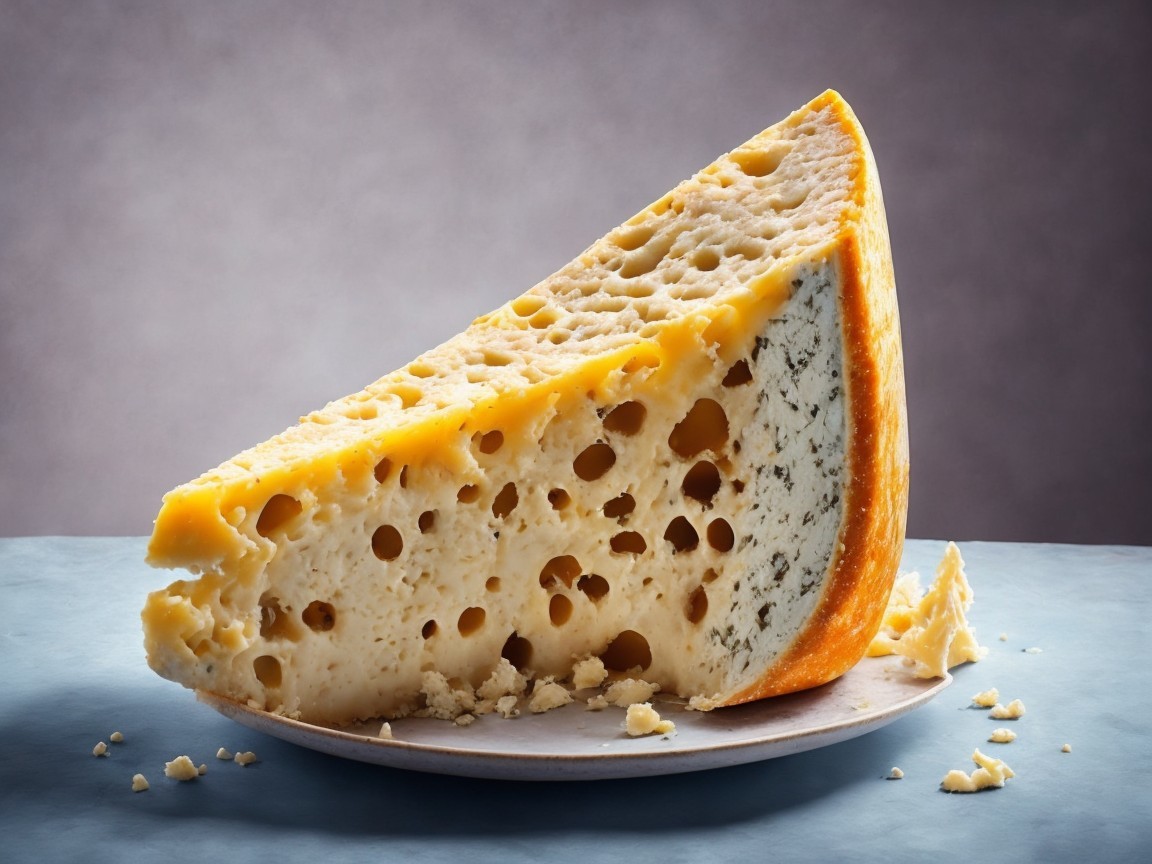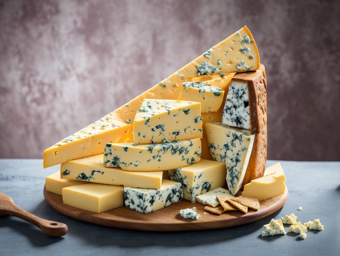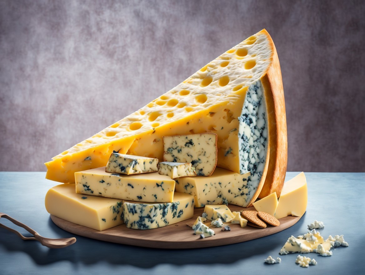 A beautifully arranged cheese platter featuring various types of cheese, including yellow and blue varieties. The cheeses are cut into elegant shapes, resting on a wooden board.