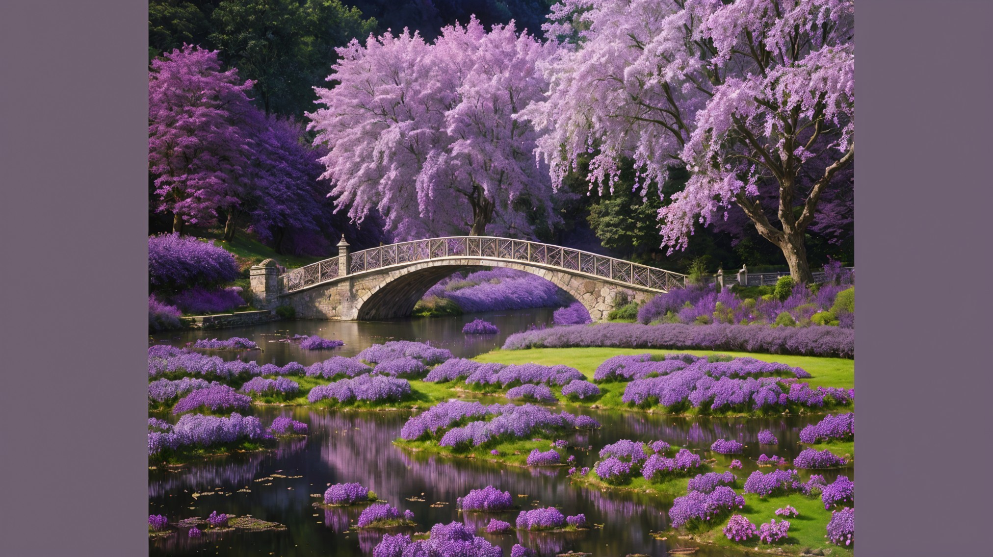 Stone bridge over a majestic river, charming village nestled among lush trees, misty mountains in the backdrop, vibrant purple color palette, delicate floral details, warm cozy lighting, ultra-detailed 3D line art, zentangle artistry for uniqueness, depth and tranquility, autumnal atmosphere, grapes, amethysts, violets, lilacs, plums, eggplant hues, Josephine Wall, Arthur Rackham, Magritte style, Giuseppe Arcimboldo inspiration, intricate like John James Audubon, vibrancy of Ernie Barnes, Gian Lorenzo Bernini's intricate beauty, acrylic medium, award-winning quality, beautiful lighting.