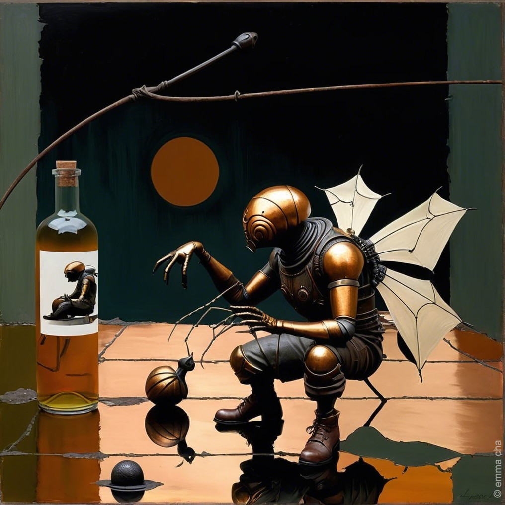This piece blends surrealism and symbolism, evoking the works of Salvador Dalí and René Magritte. The use of reflective surfaces and distorted proportions, combined with the ambiguous narrative of the bottle, explores altered perceptions and the subconscious. The muted, earthy tones paired with metallic textures bring out a steampunk-influenced surreal style. The bottle's presence hints at escapism, altered realities, and introspection.