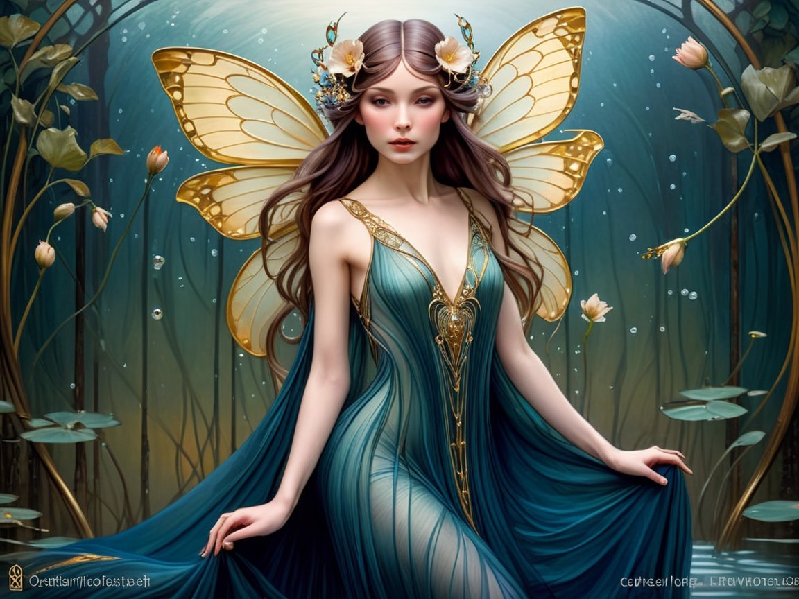 A serene, ethereal figure with butterfly wings stands gracefully amidst soft flowers, embodying a magical blend of nature and elegance in a vibrant, enchanted setting.