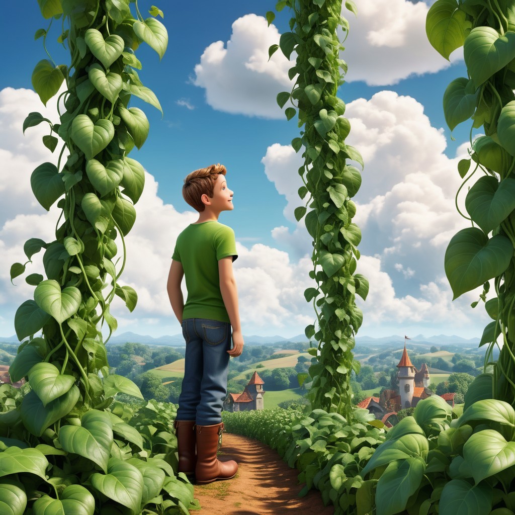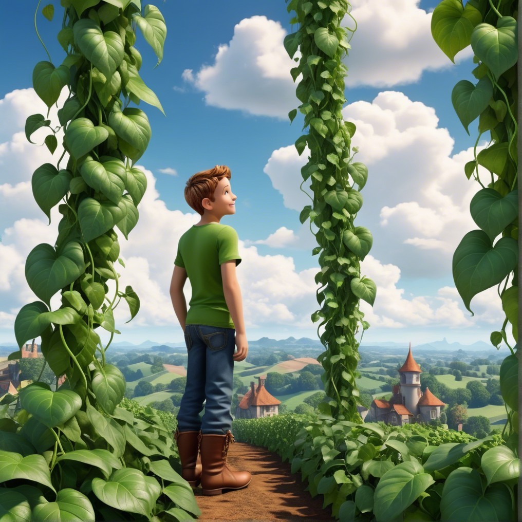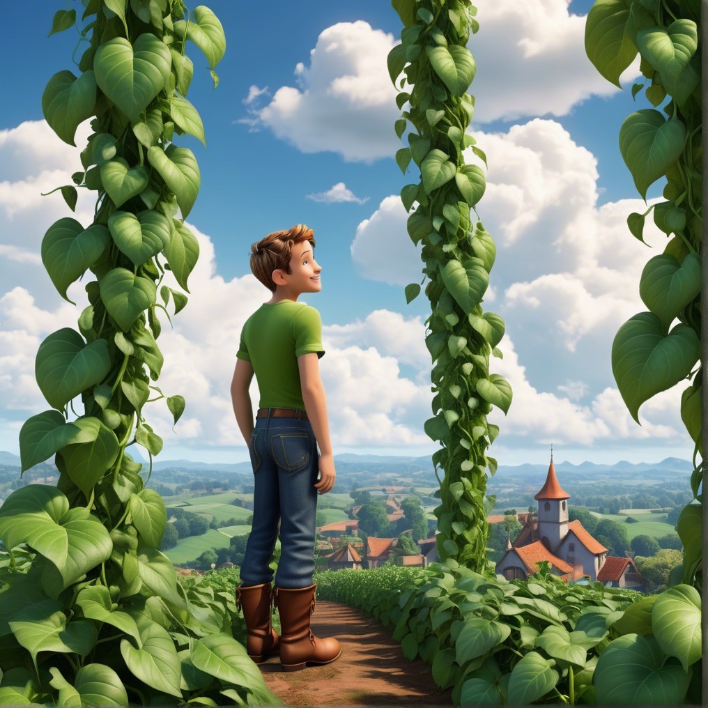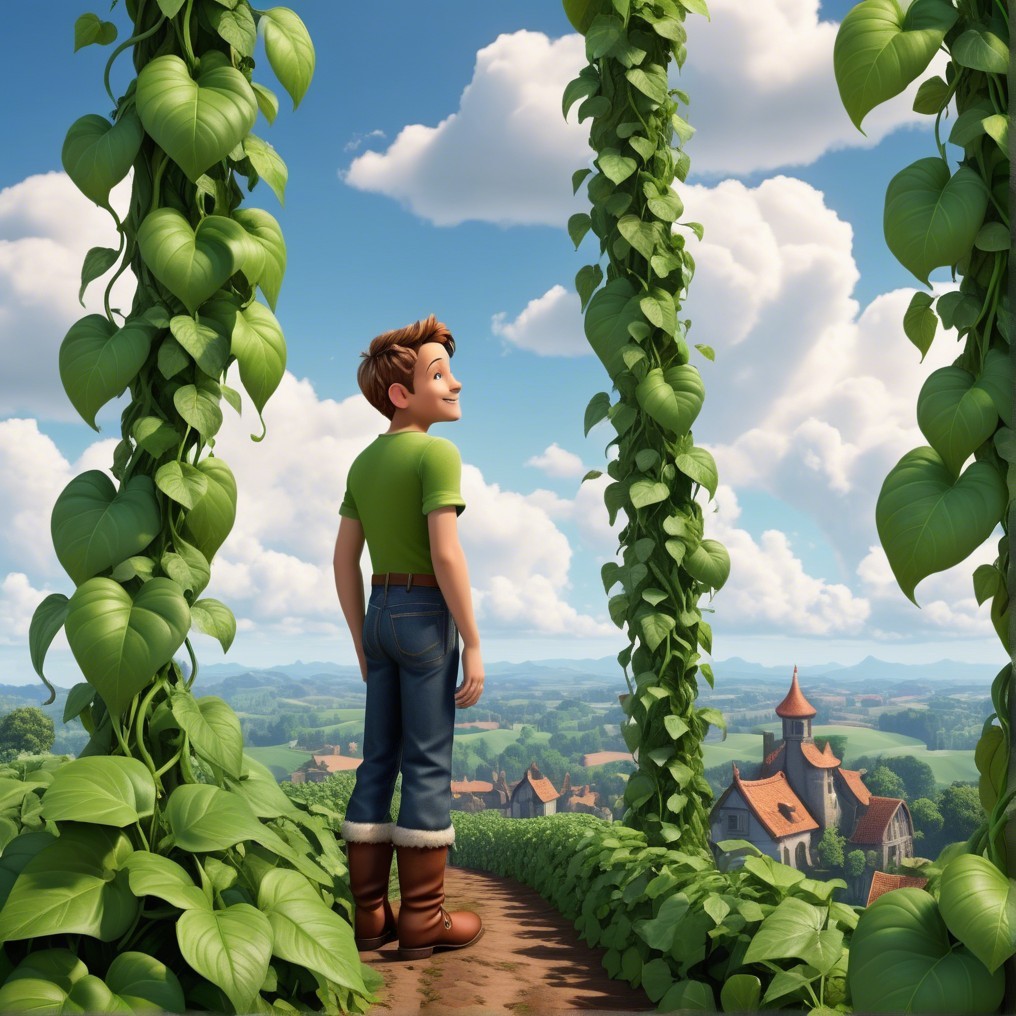 Jack stands surrounded by lush green vines, gazing out at a picturesque landscape with rolling hills and a quaint village under a bright blue sky dotted with fluffy clouds.