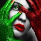 A striking portrait of a woman with vibrant makeup featuring bold red and green colors. Her blue eyes pop against the dramatic face paint, complemented by glossy red lips and stylish nails.