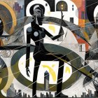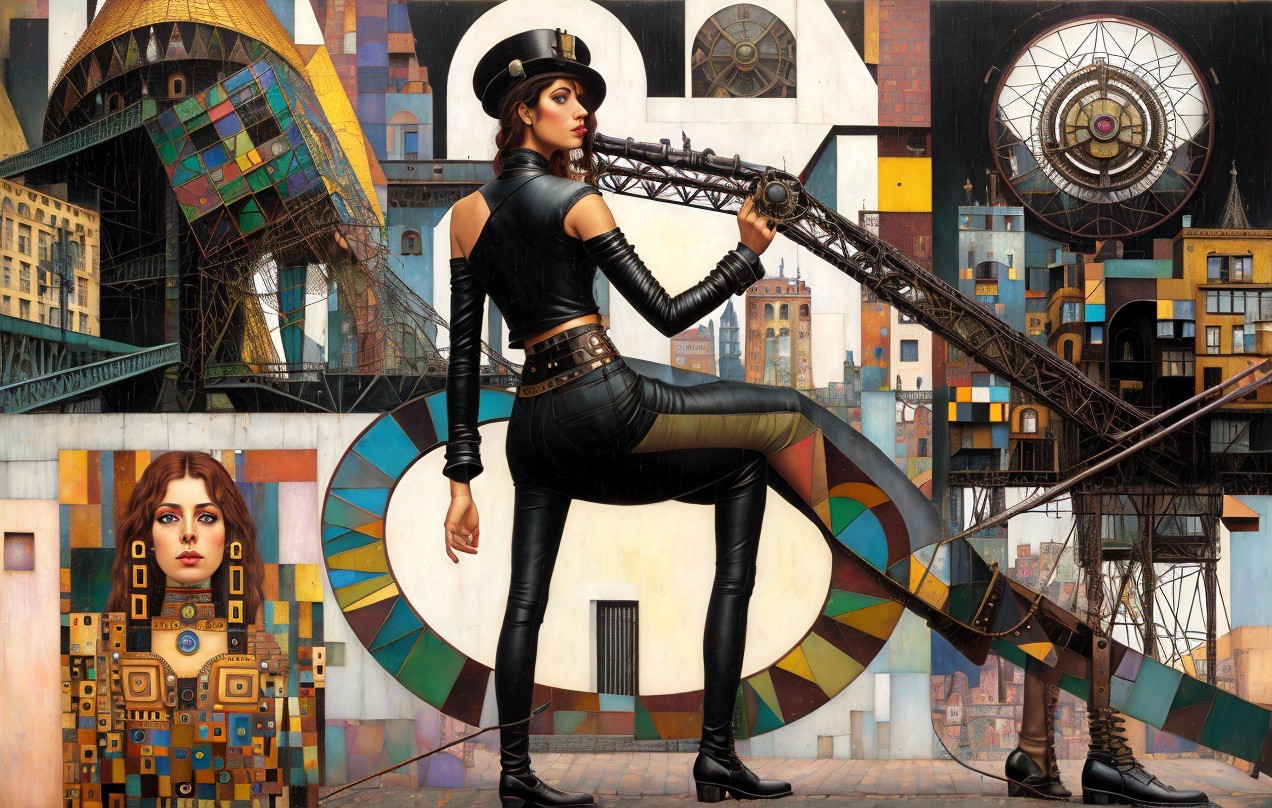 The artwork features a stylized woman in a black outfit, striking a powerful pose against a backdrop of intricate geometric patterns, industrial structures, and a steampunk aesthetic.