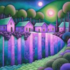 A vibrant, surreal landscape features colorful houses reflected in a shimmering lake, bordered by lush greenery and tall cypress trees under a moonlit and sunlit sky.