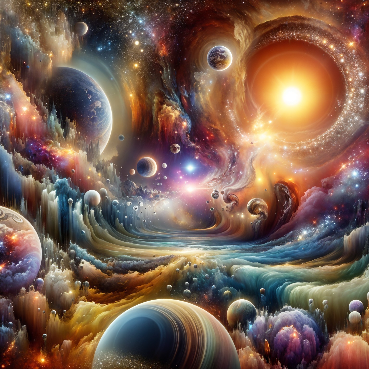 A stunning cosmic scene featuring vibrant planets, swirling gases, and bright stars. Dramatic landscapes with rocky terrain and a radiant sun creating awe-inspiring alien worlds.