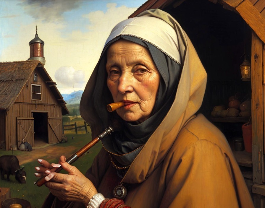 Elderly woman smoking pipe with headscarf and shawl in rural setting
