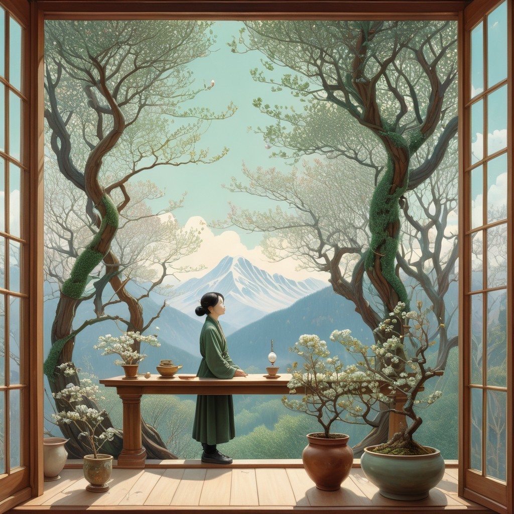 A serene scene shows a woman in a green robe, standing in a sunlit room with large windows. Outside, mountains rise above a tranquil lake, framed by blooming trees and bubbling water.