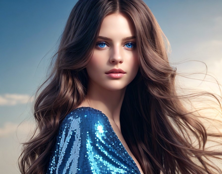Woman in sequined blue outfit with wavy brown hair