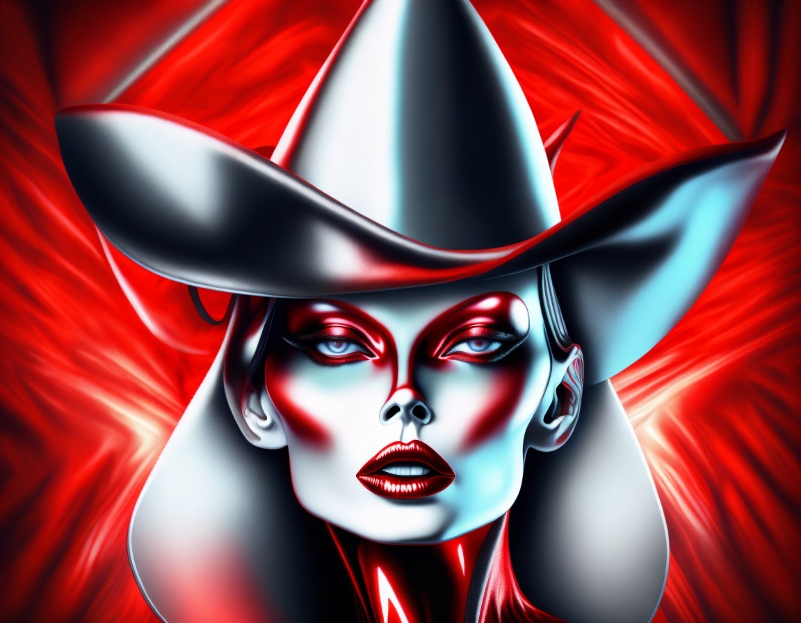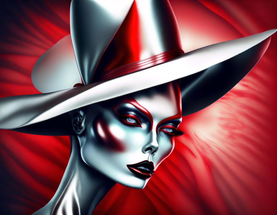 Vibrant digital artwork of a woman with striking features wearing a wide-brimmed hat, highlighted by deep reds and blues.
