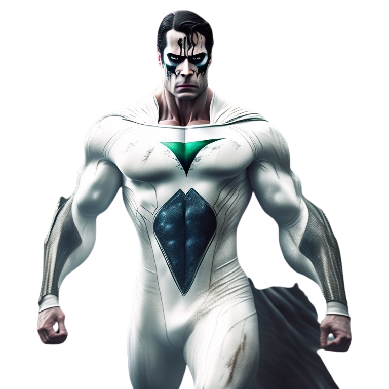 A muscular superhero stands confidently, clad in a vibrant green and blue costume with a flowing white cape. His intricate helmet features a striking design, adding to his powerful presence.
