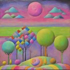 A colorful, abstract landscape featuring geometric shapes. Tall trees, a pink house, rolling hills, and a large sun create a serene yet vibrant scene, blending soft hues with playful forms.