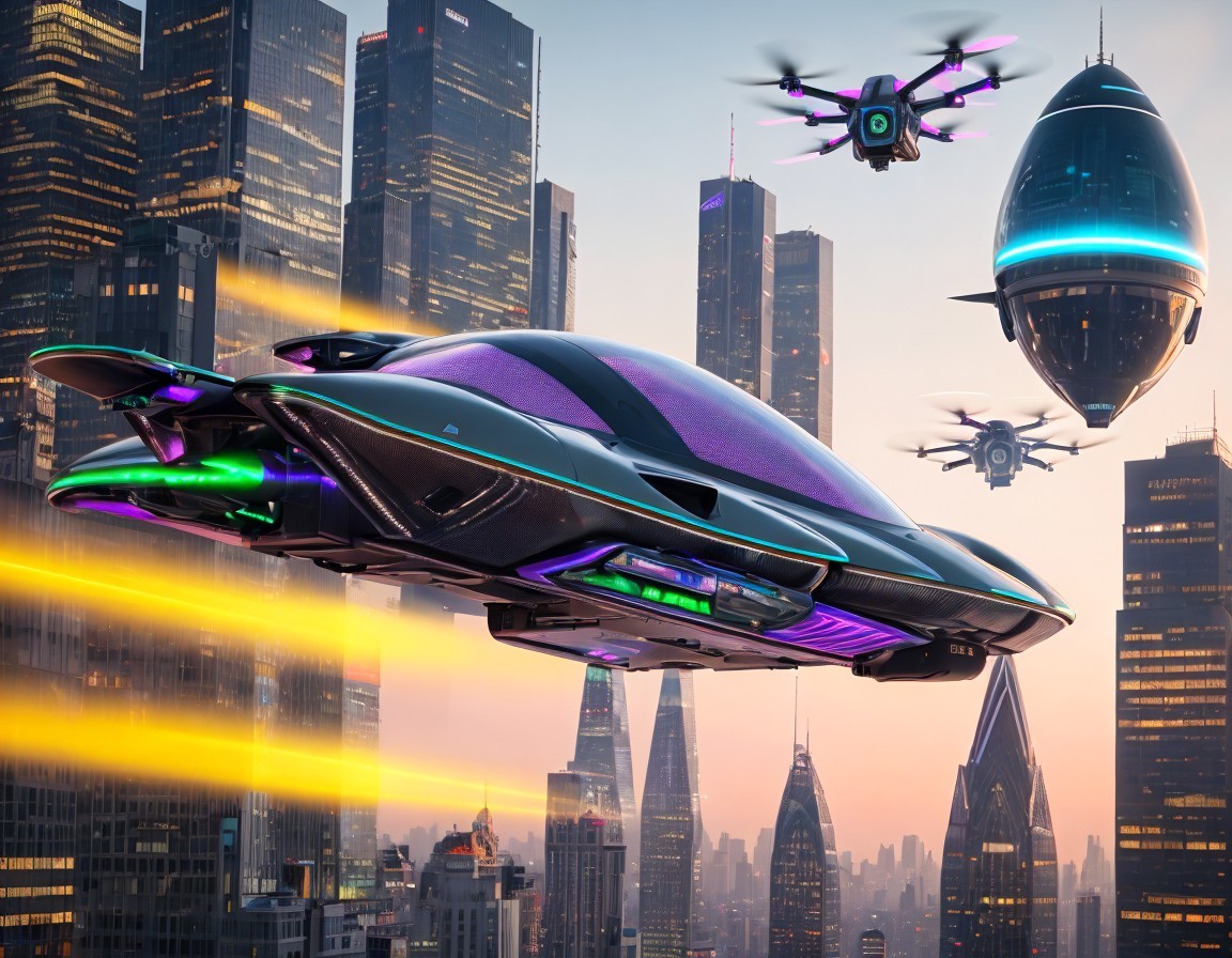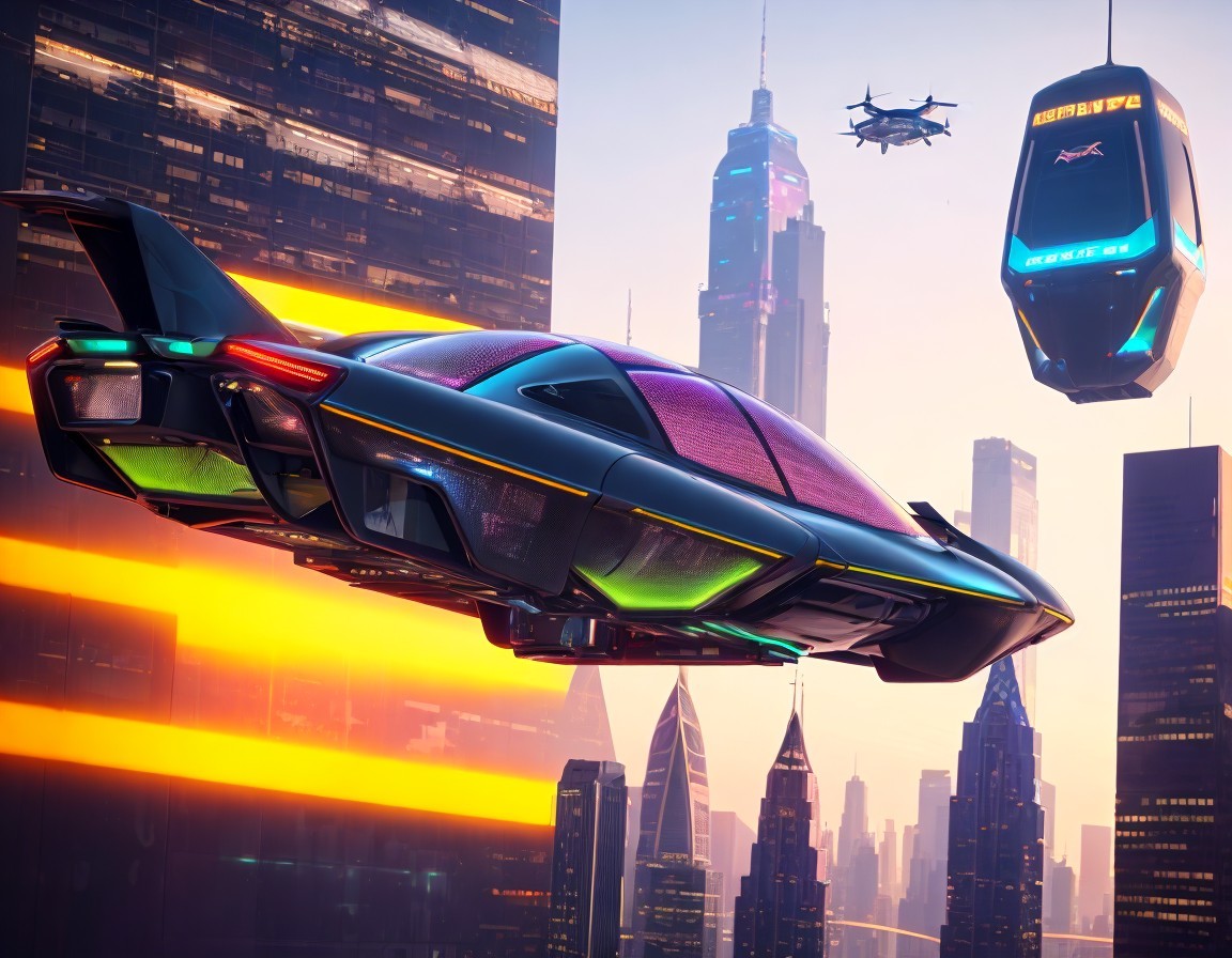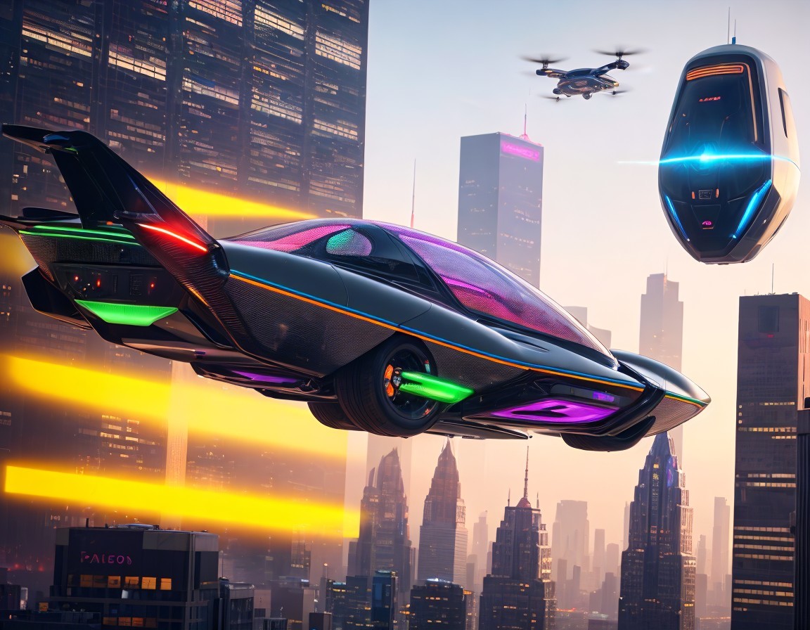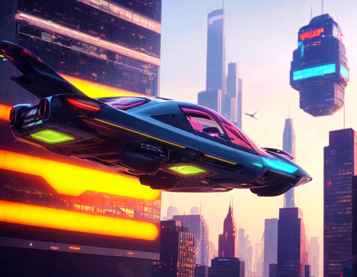 Prompt: "Sleek futuristic flying car, hovering above a bustling old futuristic city, intricate cityscape below, vintage architecture mixed with advanced technology, neon lights reflecting off skyscrapers, flying drones in the sky, holographic billboards, bustling streets, retro-futuristic vehicles on roads, metallic surfaces, glass facades, urban decay elements, advanced transportation concept, digital art, vibrant color palette with blues, purples, and neon accents, dynamic lighting casting dramatic shadows, created in a cyberpunk style, high-resolution, by Syd Mead and Simon Stålenhag, ArtStation."