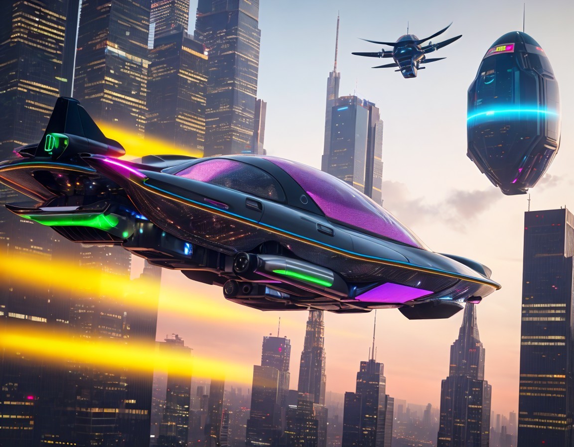 Sleek futuristic flying car, hovering above a bustling old futuristic city, intricate cityscape below, vintage architecture mixed with advanced technology, neon lights reflecting off skyscrapers, flying drones in the sky, holographic billboards, bustling streets, retro-futuristic vehicles on roads, metallic surfaces, glass facades, urban decay elements, advanced transportation concept, digital art, vibrant color palette with blues, purples, and neon accents, dynamic lighting casting dramatic shadows, created in a cyberpunk style, high-resolution, by Syd Mead and Simon Stålenhag, ArtStation.