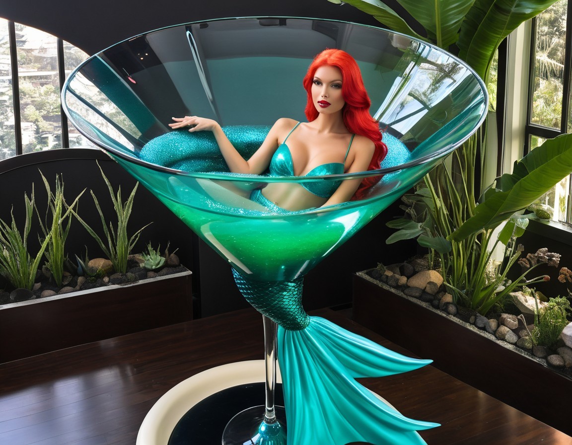 A model poses gracefully in a large, turquoise martini glass, adorned in matching lingerie. The scene features lush greenery, creating a striking and vibrant contrast.