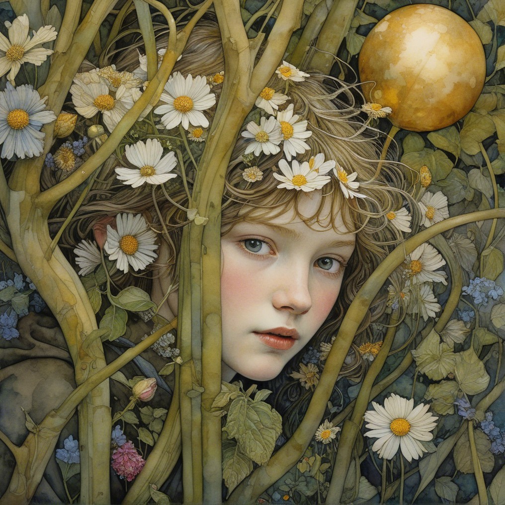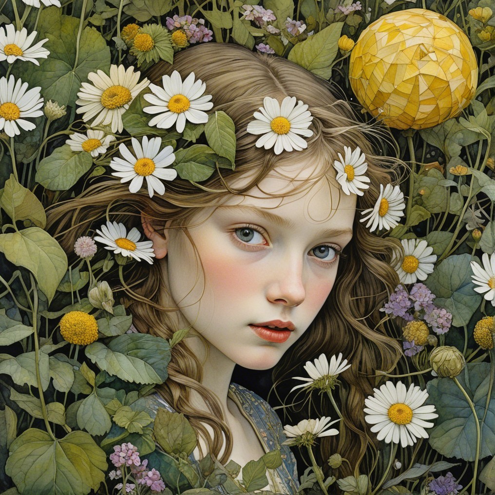 A young girl with long, flowing hair adorned with daisies gazes softly from a lush field filled with vibrant wildflowers, capturing a serene and enchanting moment in nature.