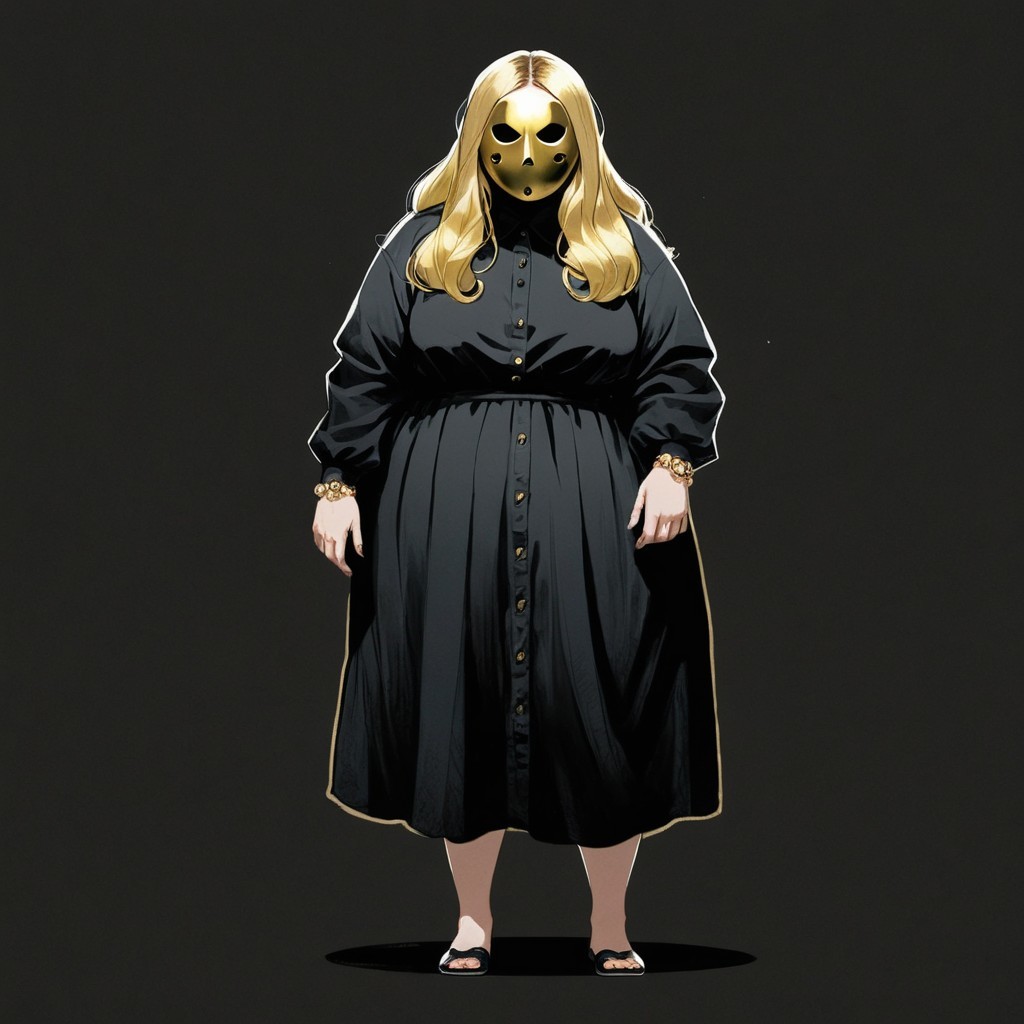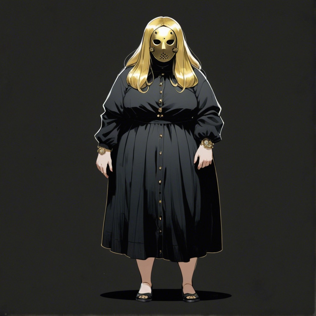A figure stands wearing a long black dress and a unique golden helmet with intricate designs. The outfit is complemented by large buttons, and the overall look is both mysterious and striking.