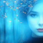 A captivating portrait of a woman with a serene expression, surrounded by flowing blue hues and golden fish. The dreamy atmosphere evokes a sense of tranquility and connection to the sea.