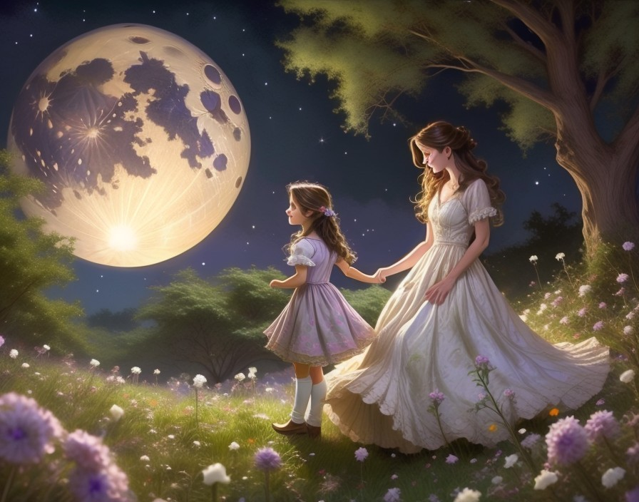 A woman and a girl in dresses hold hands in a magical meadow at night, gazing at a large, luminous moon near a tree.