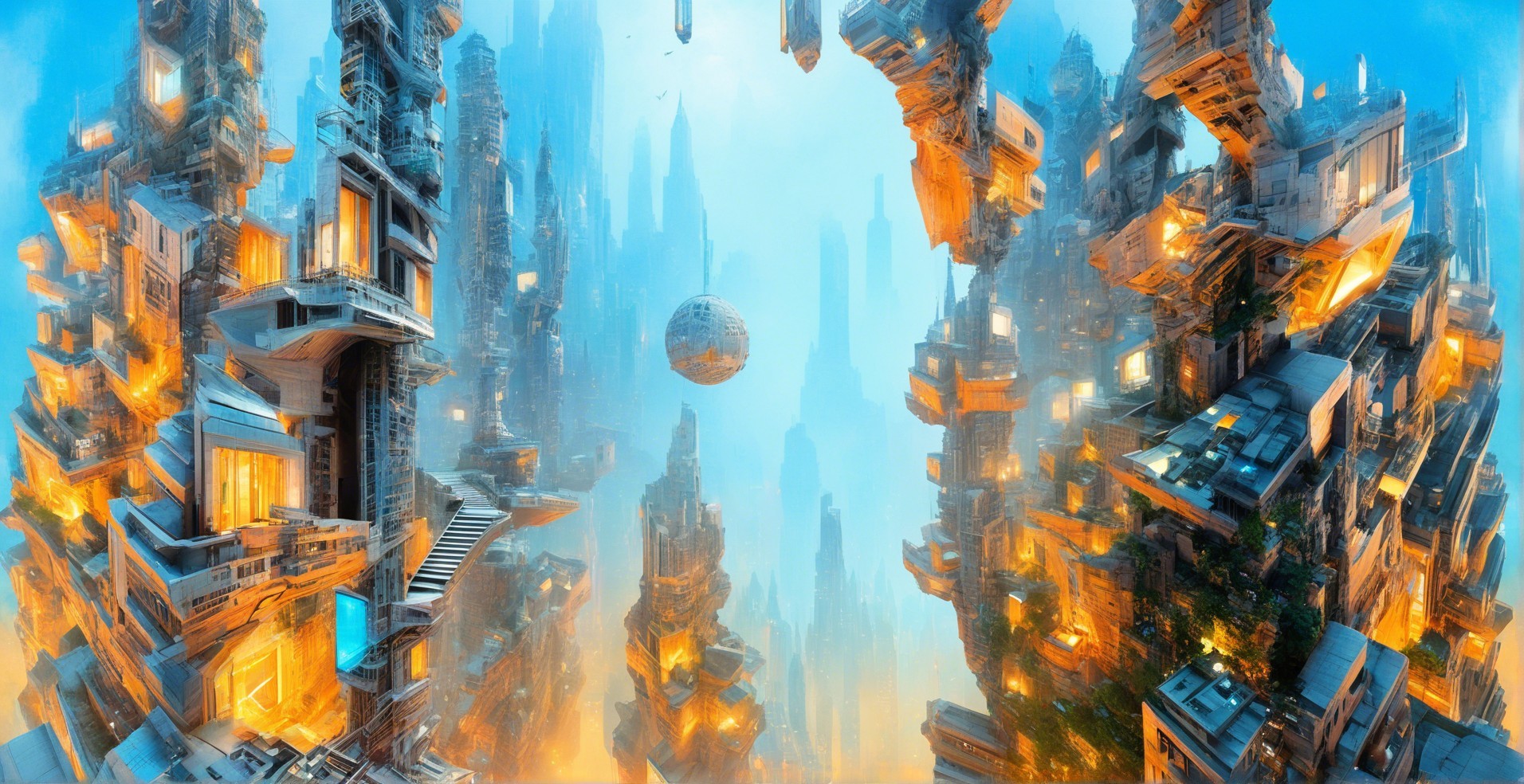 A sprawling futuristic cityscape of stacked, illuminated structures against a dreamy blue sky, blending nature with advanced architecture, creating a surreal and vibrant urban environment.