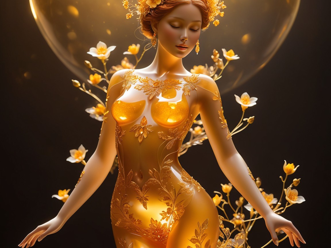 A graceful figure adorned in shimmering golden body art, featuring floral motifs. The ethereal background radiates light, enhancing the serene and alluring atmosphere.