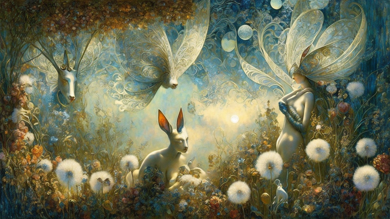 The image depicts two ethereal women in elegant, flowing dresses. One gazes thoughtfully at a small flame in her palm, while the other reclines gracefully, surrounded by delicate flowers and a dreamy background.