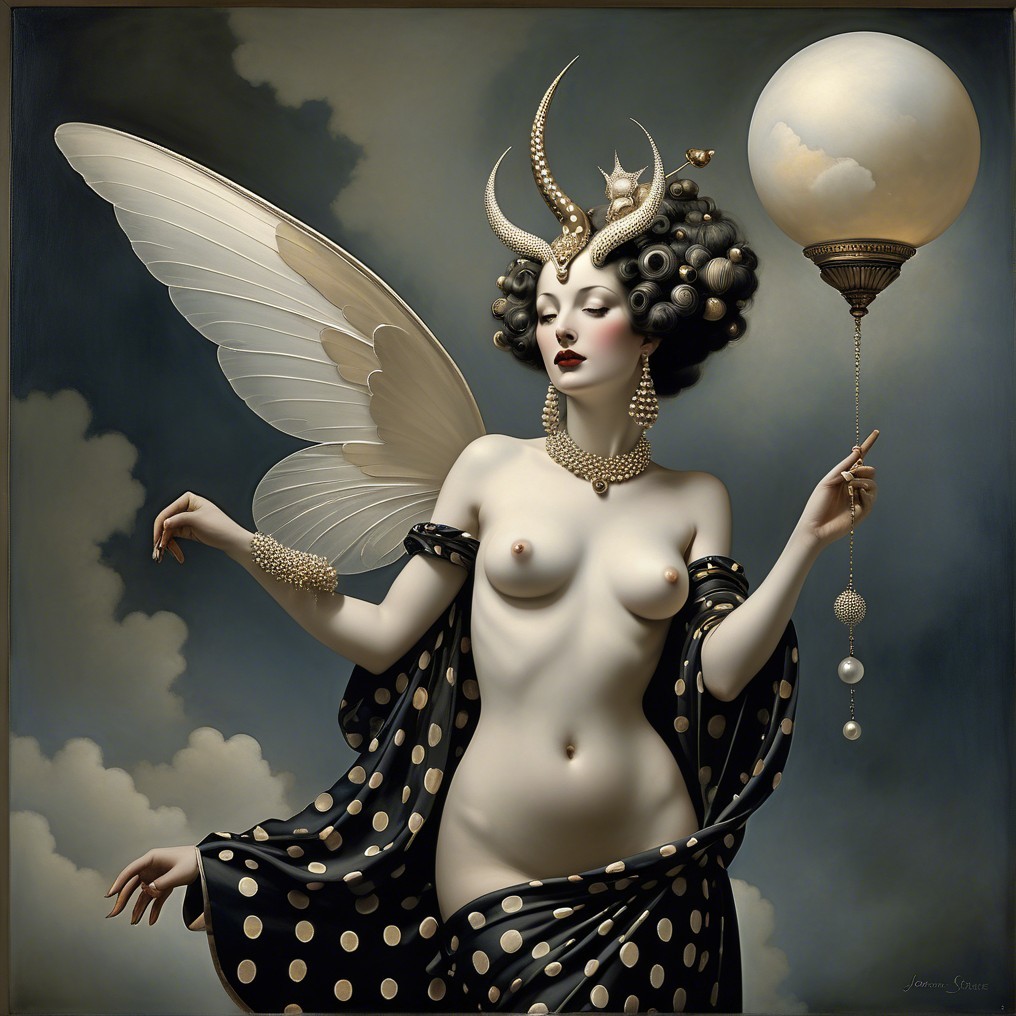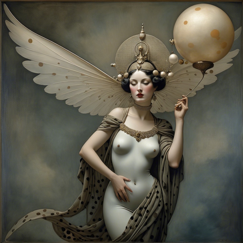 Prompt: A woman adorned in spots. Surreal dream in the style of Michael parkes. Whimsy of catrin wells stein , nostalgia, glory, Mercury Glass patina, light and gossamer haze, moody, Art Brut, moody, somber, desaturated colors. In the style of John Rogers cox . This artwork amalgamates the artistic styles of Michael Parkes,