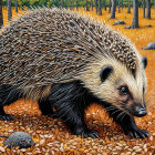 In an autumn forest, a porcupine stands guard over its two young, surrounded by orange and yellow fallen leaves. The scene captures a tranquil wildlife moment.