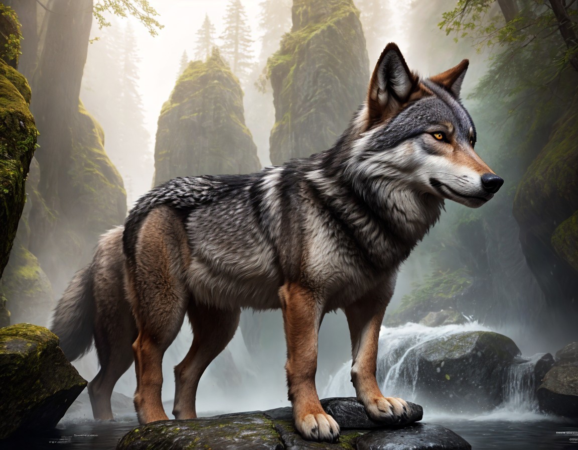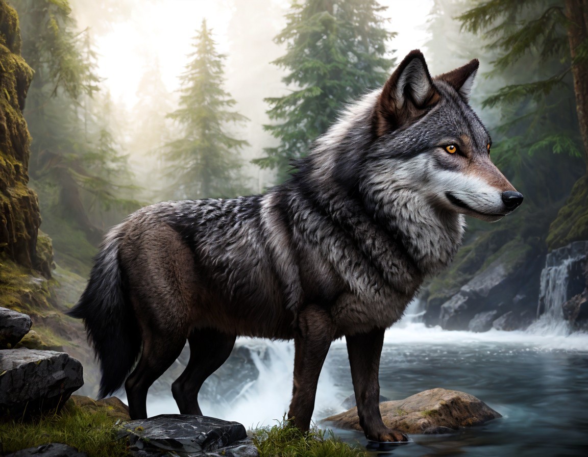 A majestic wolf stands in a misty forest stream, surrounded by tall trees. Its thick fur glistens in the soft light, showcasing shades of gray and brown, embodying a sense of wild beauty.
