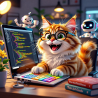 Original prompt: A stunningly beautiful and hilarious 3D animation style cartoon of a happy, fluffy orange tabby cat wearing thick-rimmed glasses, sitting at a modern desk and programming on a sleek laptop. The cat has a huge, joyful smile and is typing furiously on a colorful mechanical keyboard. The screen displays complex, glowing lines of code. The scene is filled with positive energy: a cute robot assistant holds a cup of coffee, books titled "Purrthon for Beginners" and "The Art of Code" are on the desk next to a plant with smiling flower faces. Warm, bright, cinematic lighting illuminates the scene, creating a soft glow and playful shadows. The style is ultra-detailed, Pixar-inspired, with a vibrant color palette of oranges, blues, and yellows. The mood is incredibly happy, positive, and uplifting. Sharp focus, 4k, hyperrealistic textures, rendered in Unreal Engine.
