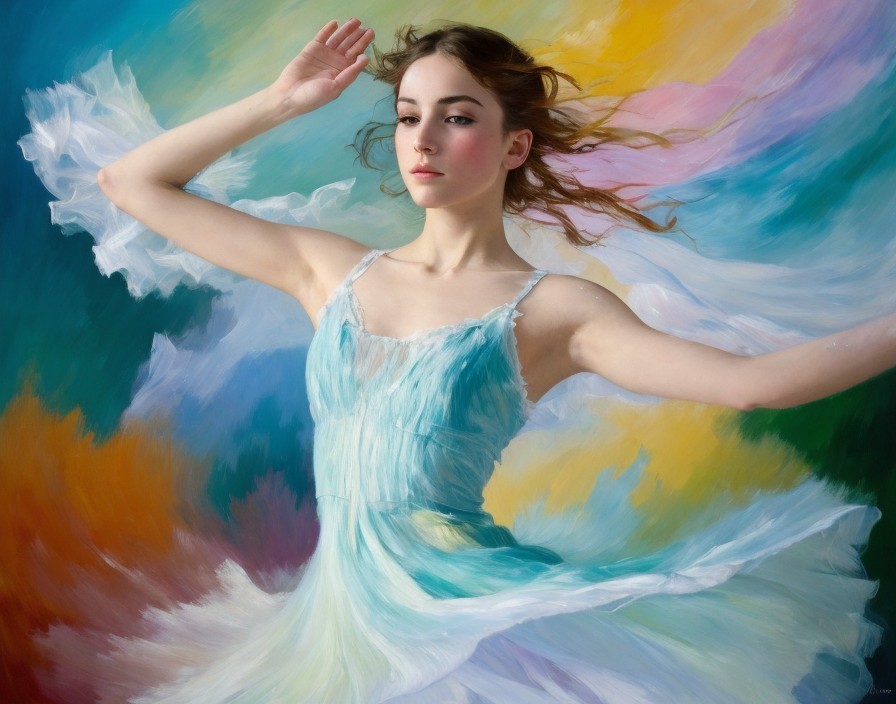 Prompt: "Action painting. The young woman practising solo modern, intuitive dance in gauzy dress. Shot in movement, oil on canvas.