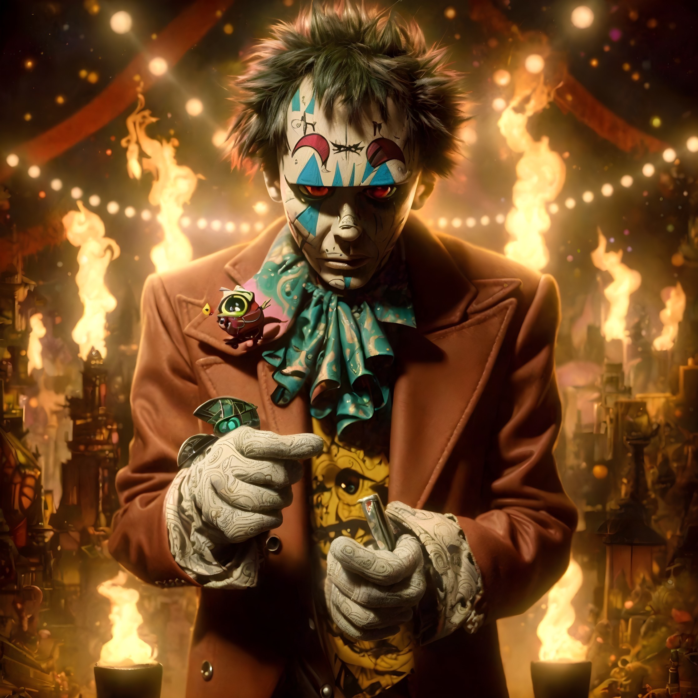 A sinister clown stands in front of a fiery circus backdrop, wearing a torn suit and a colorful scarf. His exaggerated makeup and intense expression create a chilling atmosphere.