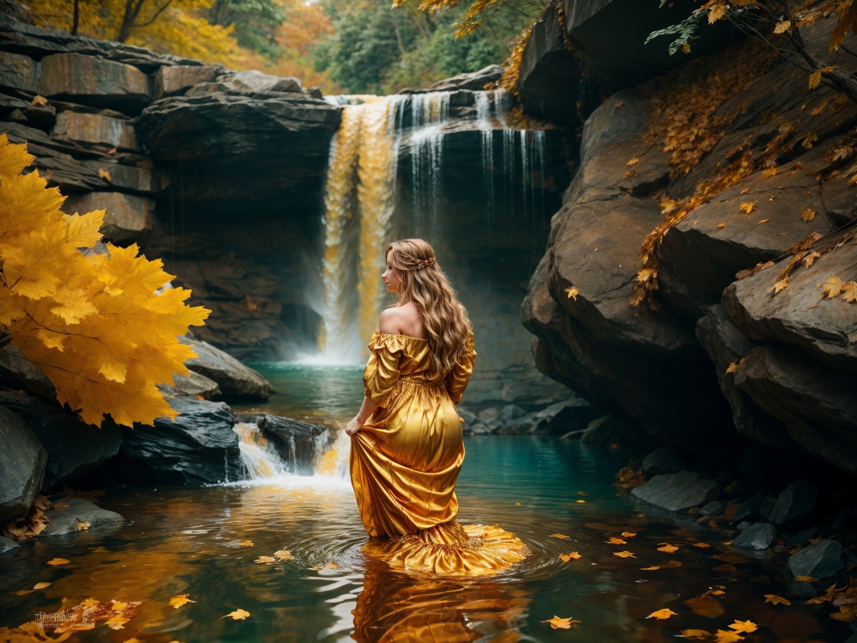 A woman in a shimmering gold gown stands by a tranquil waterfall, framed by autumn leaves. The scene exudes a magical, serene atmosphere with vibrant fall colors.
