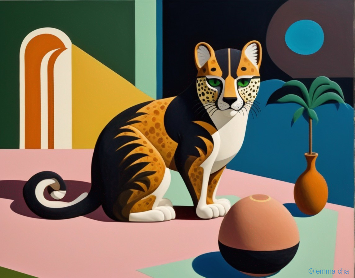 A stylized painting of a cat with patterned fur, sitting beside a sphere and a plant, with colorful geometric shapes in the background.