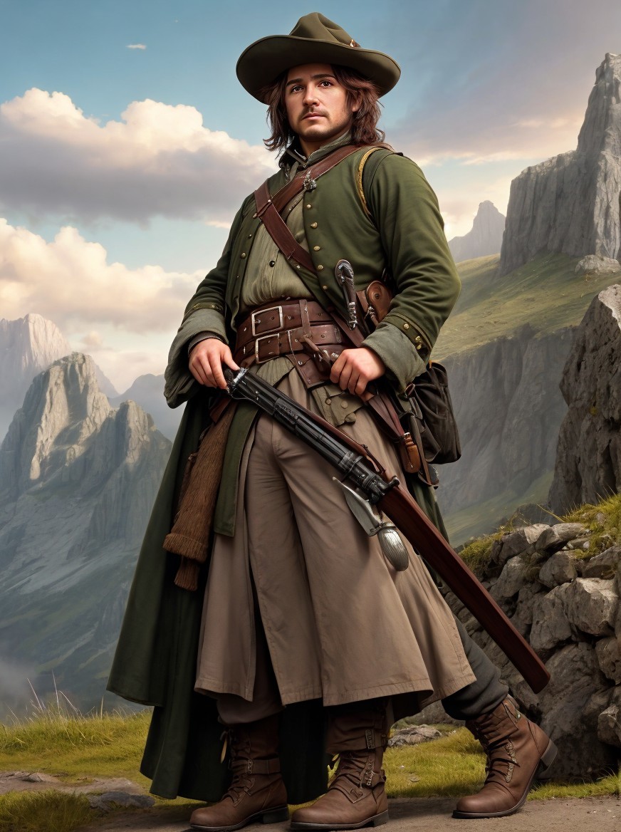 A rugged character stands confidently in a green cloak and wide-brimmed hat, holding a rifle in a picturesque landscape with mountains and flowers around. Adventure and bravery emanate.