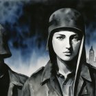 The painting features a soldier in uniform and a woman in military attire, set against a vibrant sky. They gaze forward, symbolizing unity and resilience amidst a historical landscape.