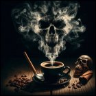 A decorative skull sits amid two ornate coffee cups. One cup emits flames, while the other releases wisps of steam. Surrounding them are scattered coffee beans, creating a dramatic, moody ambiance.